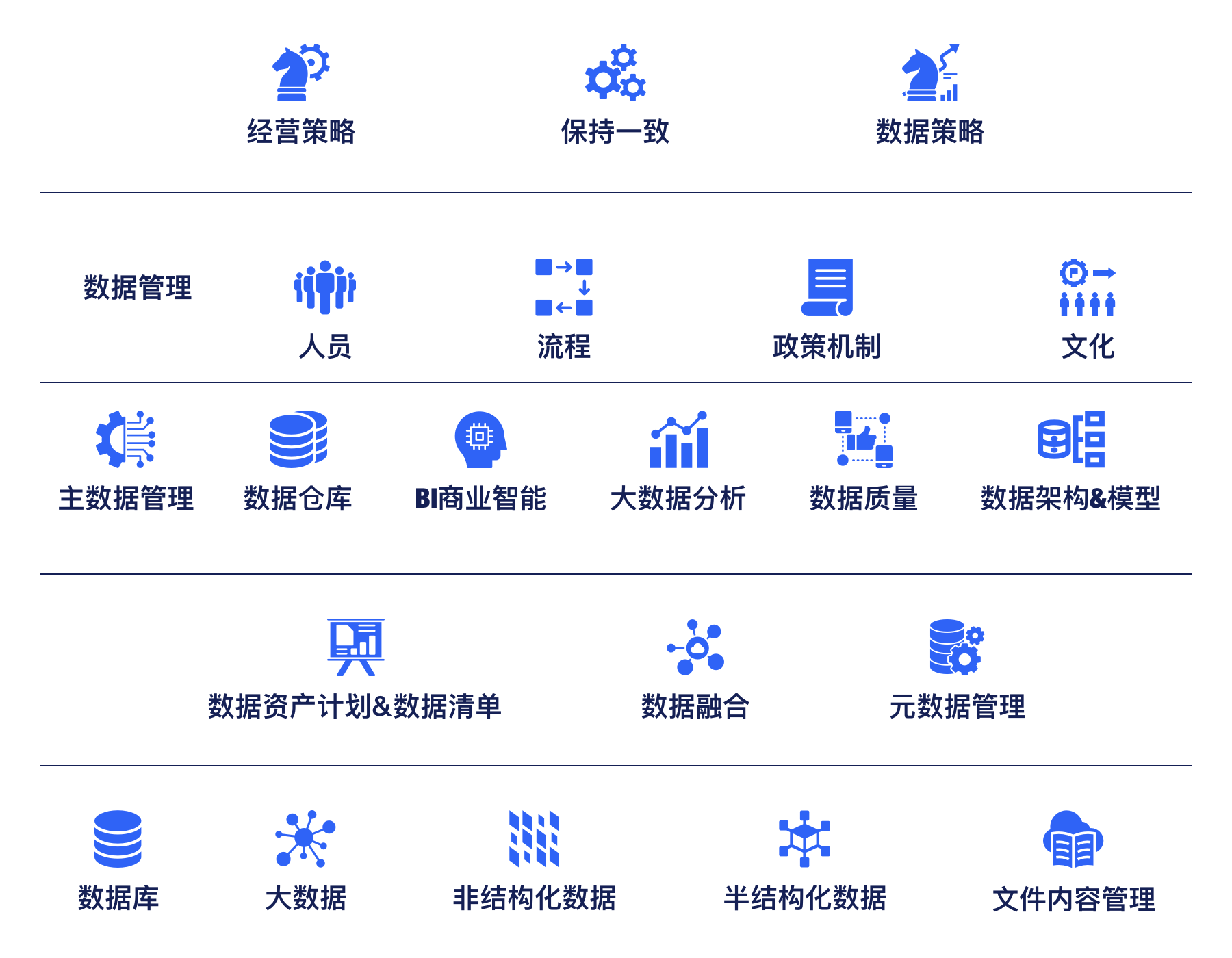 具体包括:阐明目标愿景和实现该愿景的实用指南,明确阐述成功标准和关键绩效指标,这些指标可用于评估和合理化所有后续数据计划。而不包含针对特定技术问题的详细解决方案。随着企业目标的发展,数据战略并非一成不变,需要紧跟企业的技术创新和运作方式。