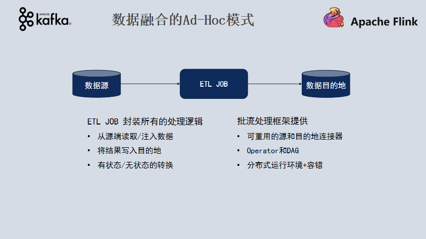 另一种模式是ETL JOB本身输入输出实际上都是面对消息队列的,实际上这是现在最常使用的一种模式。在这种模式下,需要通过一些独立的数据源和目的地连接器,来完成数据到消息队列的输入和输出。ETL JOB可以用多种框架实现,包括Flink、Kafka Streams等,ETL JOB只和消息队列发生数据交换。