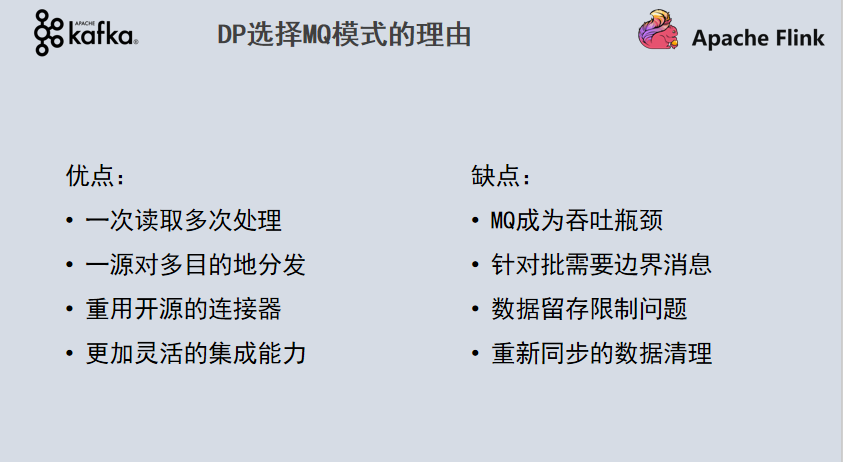 第三,Kafka是一个有持久化能力的消息队列,这意味着数据留存是有极限的。比如,你将源端的读到Kafka Topic里面,Topic不会无限的大,有可能会造成数据容量超限,导致一些数据丢失。