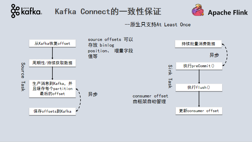 Kafka Connect如何保证数据同步的一致性?就目前版本,Kafka Connect只能支持端到端的at least once,核心原因在于,在Kafka Connect里面,其offset 的持久化与数据发送本身是异步完成的。这在很大程度上是为了提高其吞吐量考虑,但相应产生的问题是,如果使用Kafka Connect,框架本身只能为你提供at least once的语义保证。