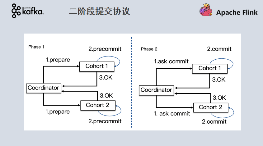 所以应用二阶段提交协议,最核心的问题是如何保证Coordinator高可用。所幸在大家耳熟能详的各种框架里,包括Kafka和Flink,都能够通过分布式一致协议实现Coordinator高可用,这也是为什么我们能够使用二阶段提交来保证事务性。