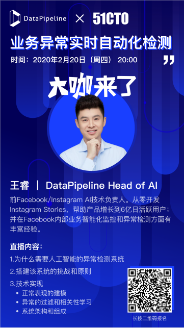 DataPipeline Head of AI,负责业务异常检测产品线。前Facebook/Instagram AI技术负责人。从零开发全球用户量最大短视频产品Instagram Stories,帮助该产品增长到6亿日活跃用户;还曾帮助多个产品部门通过AI算法实现两位数用户增长。并在Facebook内部业务智能化监控和异常检测方面有丰富经验。
