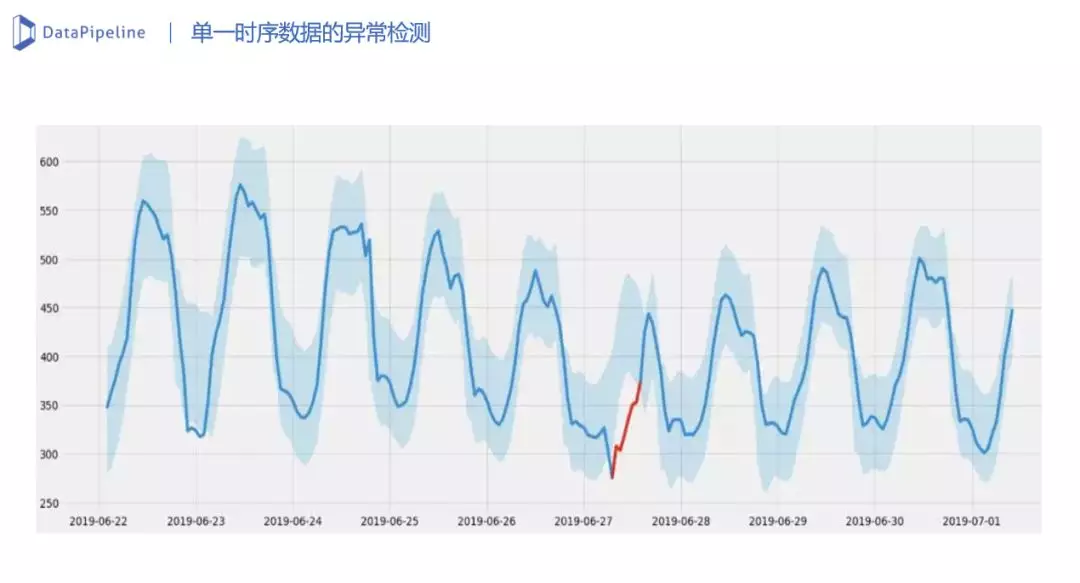 进而对每个单一的指标时序数据学习其正常表现模式,拟合模型,并自动生成置信区间。如下图,深蓝色部分为数据本身,浅蓝色部分为自动生成的置信区间,红色部分为异常。