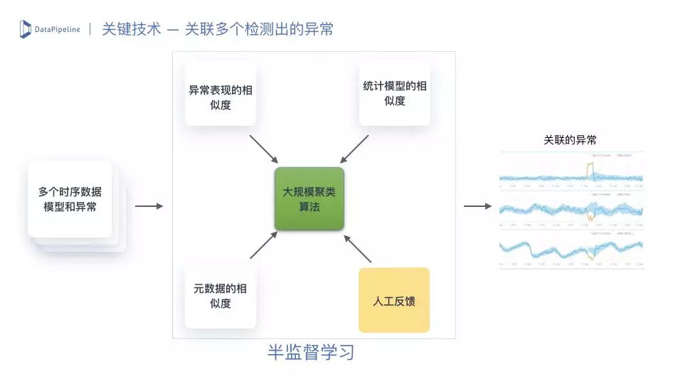 首先利用DataPipeline自身的数据集成能力,从不同数据源中接入实时的数据流或批式的数据集并进行预处理,形成多个指标的时序数据。