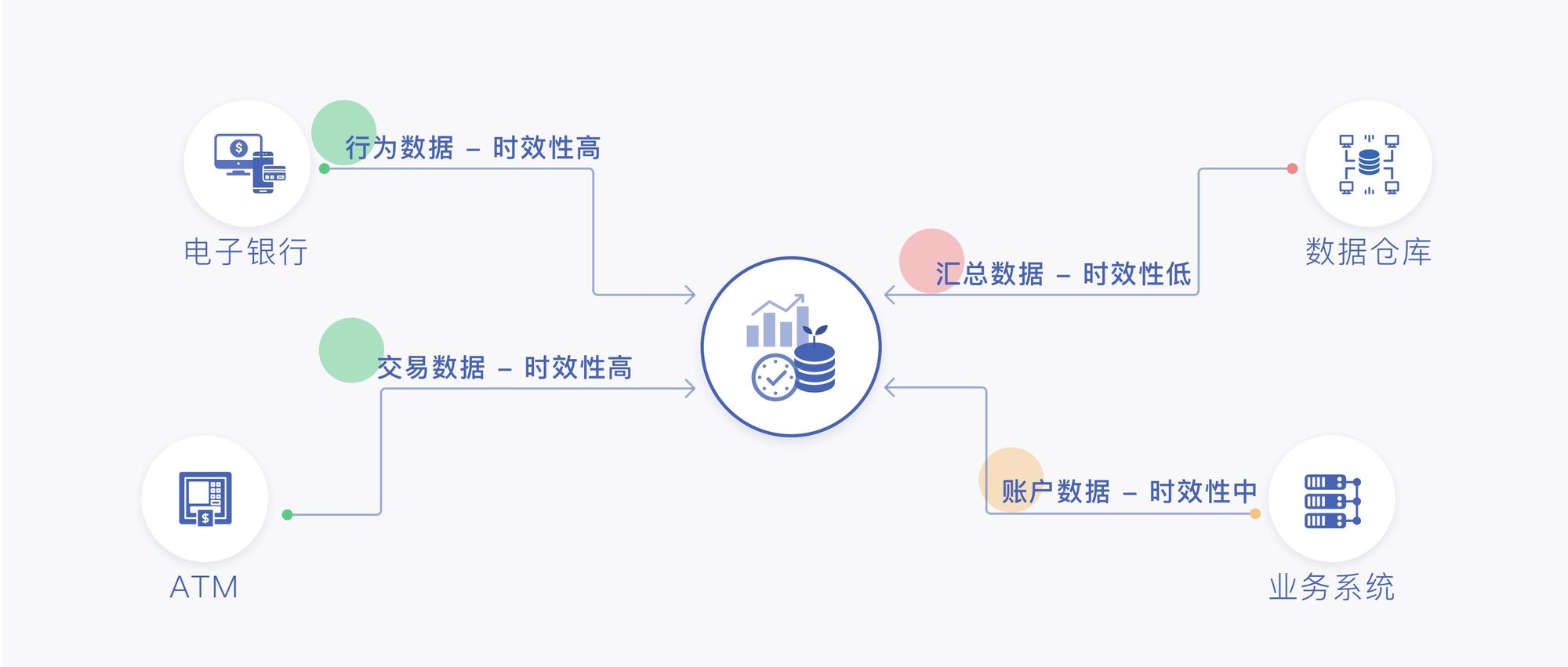 所谓数据时效性的提升指的绝不仅仅是用户行为数据、交易数据等时序数据的时效性,或者说这些数据的时效性本身都是很高的,数据时效性提升的主要战场应该是针对散落在各业务系统中没有被集中管理的各类结构化数据以及需要汇聚关联各个业务数据后加工计算的数据(说人话:没有纳入主数据系统管理的各业务系统账户、客户数据及数据仓库、集市中的分析加工结果数据的时效性一般都比较低)。