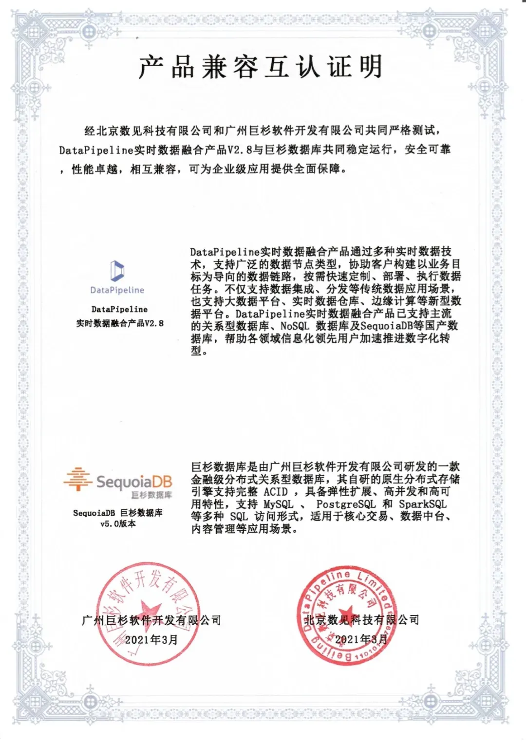近日,DataPipeline与广州巨杉软件开发有限公司完成产品兼容互认证。测试表明,DataPipeline实时数据融合平台与SequoiaDB巨杉数据库共同稳定运行,安全可靠、性能卓越、相互兼容,可为企业级应用提供全面保障。