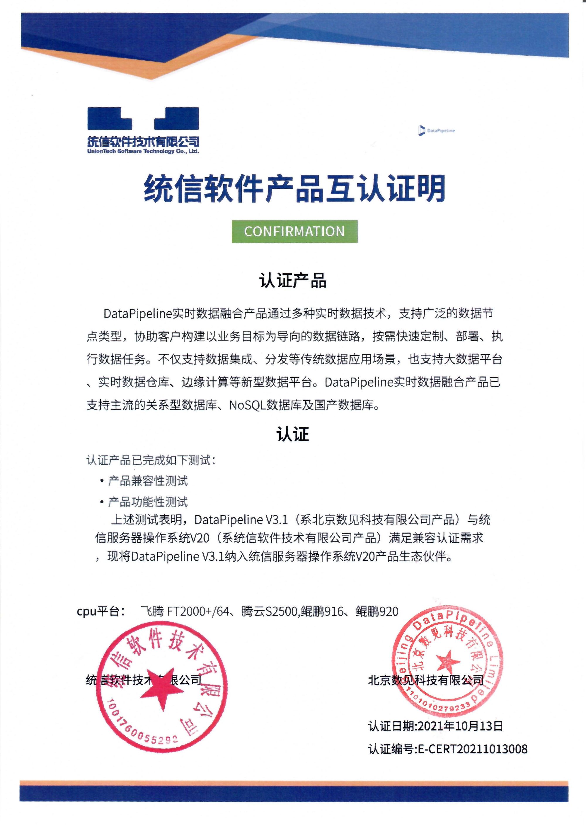 日前,DataPipeline企业级实时数据融合平台与统信软件旗下统信服务器操作系统V20完成产品互认证。DataPipeline正式成为统信软件产品生态伙伴。本次认证基于鲲鹏、飞腾CPU平台,经严格兼容性及功能性测试,结果表明:DataPipeline产品在统信服务器操作系统上运行稳定、性能优异,可为用户提供安全高效的服务。