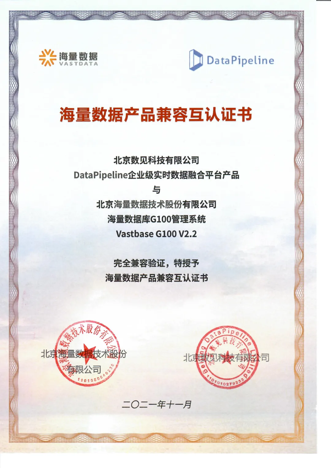 近日,DataPipeline与海量数据完成产品互认证工作。经过双方联合严格测试,DataPipeline企业级实时数据融合平台与海量数据库G100管理系统(以下简称:Vastbase G100)能够完全兼容,整体运行稳定高效,可为企业级客户提供可靠的中间件与数据库支撑。以此为基础,双方将共同助力更可靠的国产软件环境,帮助更多客户安全高效地进行信创实践及迁移,加速大中型企业数字化转型。