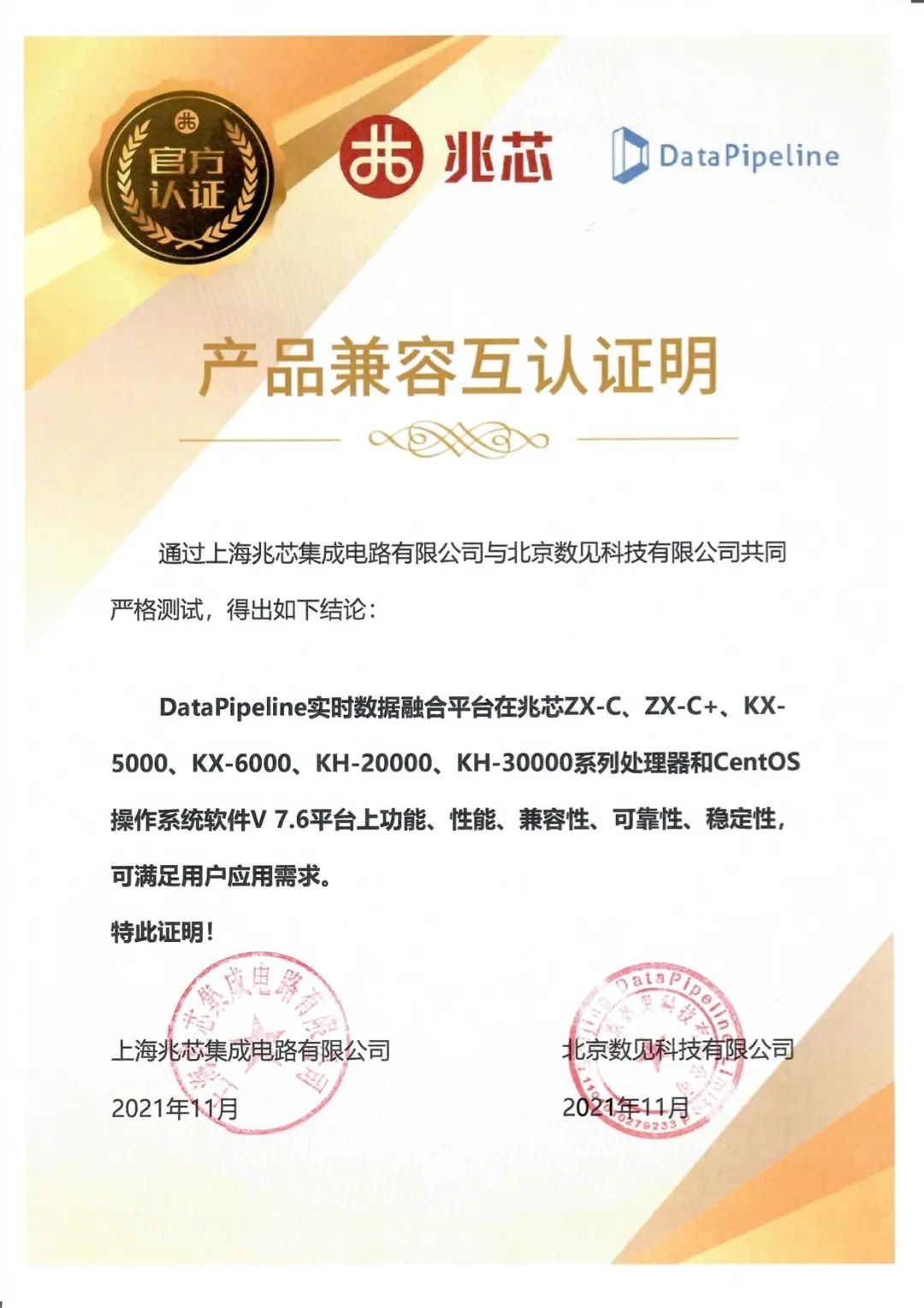 近日,DataPipeline与兆芯顺利完成产品兼容性互认证。严格测试结果表明,DataPipeline实时数据融合平台在兆芯ZX-C、ZX-C+、KX-5000、KX-6000、KH-20000、KH-30000系列处理器平台上功能、性能、兼容性、可靠性、稳定性,可满足用户应用需求。