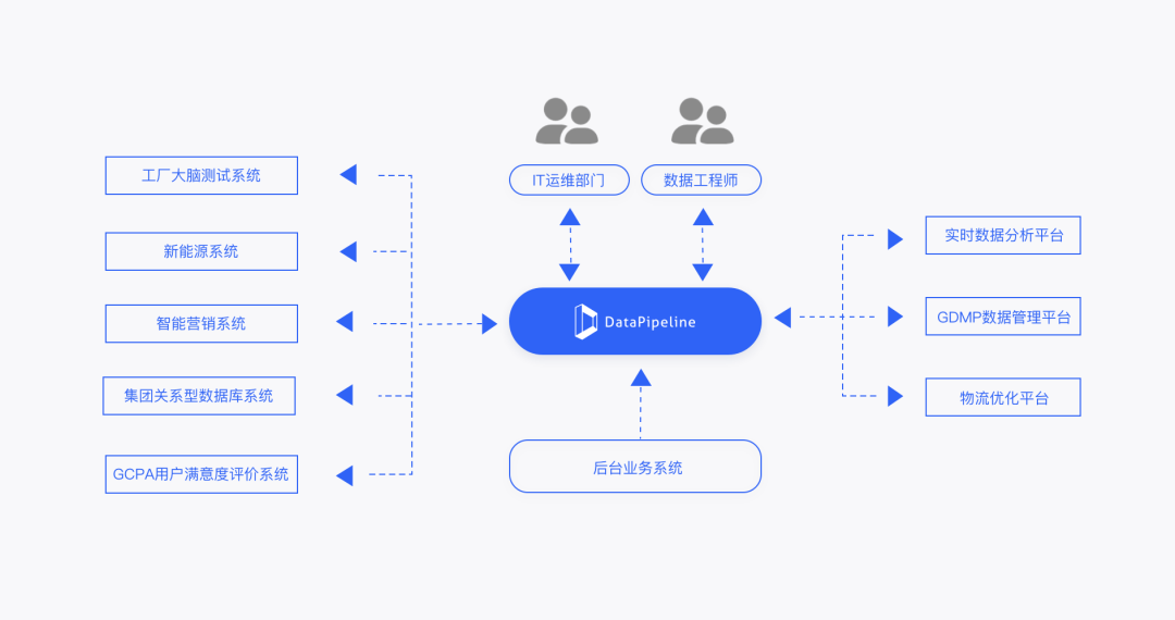 客户需要将分布于工厂大脑测试系统、新能源系统、智能营销系统、集团关系型数据库系统、用户满意度评价系统等的数据高效提供到数据管理、实时分析、物流优化等平台,以提升生产运营及企业管理的效率及质量。采用基于日志的增量数据获取等技术,DataPipeline为吉利集团智能制造、智慧营销、客户服务等实时应用场景提供各类数据管理技术秒级延迟的实时数据采集与分发,打通了SQL Server、MySQL 5.7、Hive等数据库管理技术。