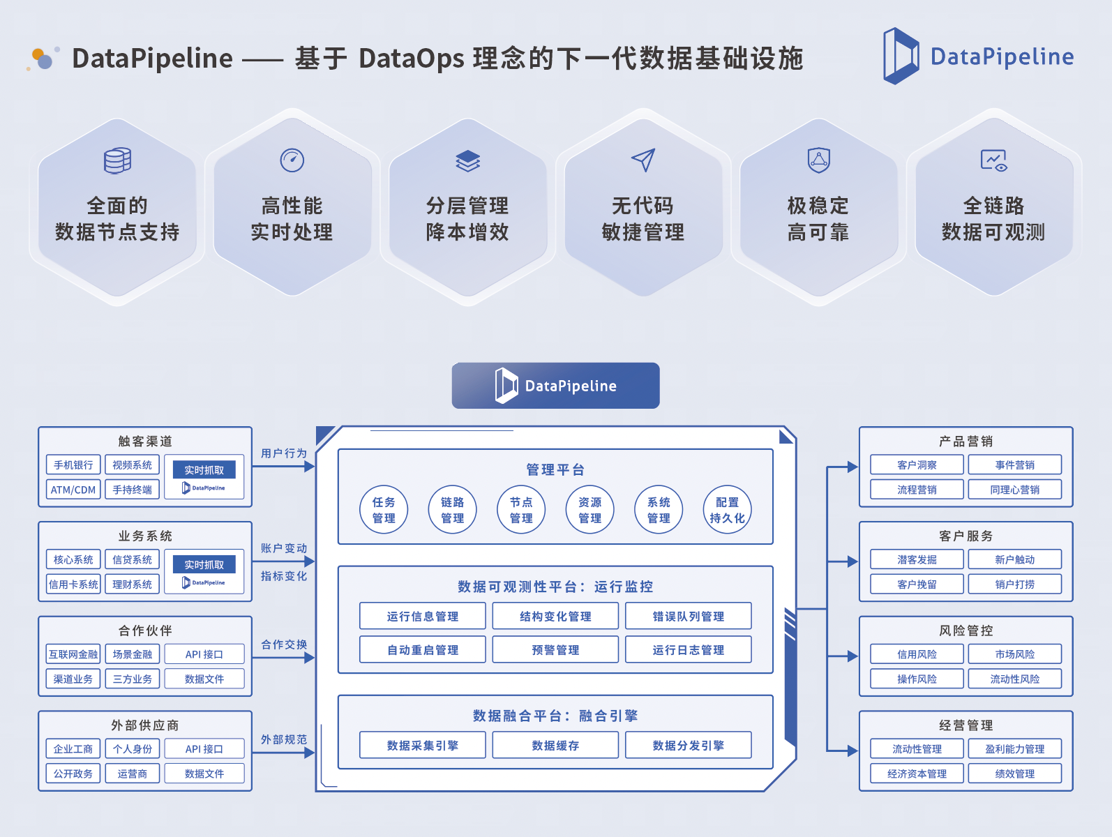 DataPipeline企业级实时数据融合平台以全面性、高速传输、强协同、敏捷性、稳定性和易维护性六大特点脱颖而出。平台支持经营管理、风险控制和营销决策等多种应用场景,通过构建端到端的数据链路,助力金融机构释放数据价值并实现数字化创新。此外,DataPipeline的解决方案全面支持信创,已被金融信创生态实验室选为「金融信创优秀解决方案」,有力支持金融行业的高质量发展。