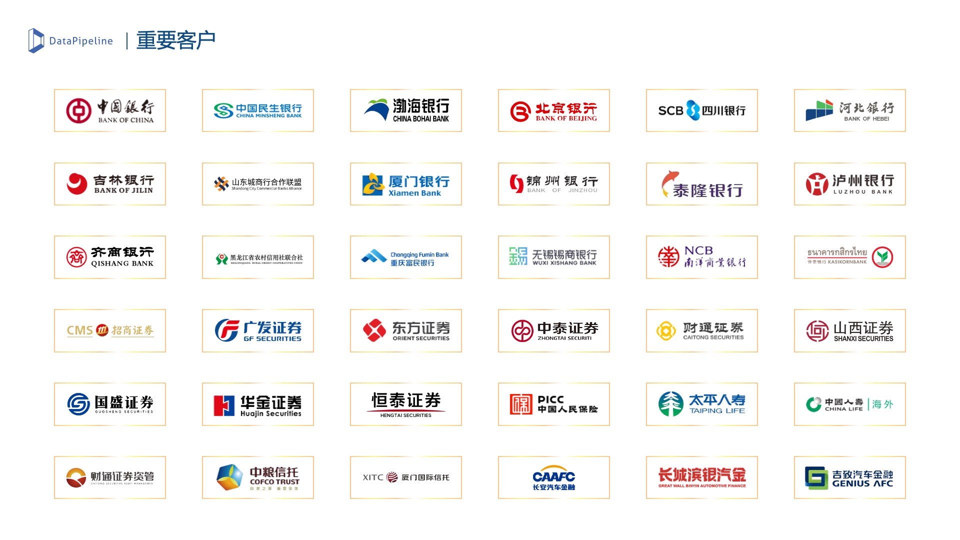 自成立以来,DataPipeline始终专注于为信息化程度高、业务发展迅速的企业提供服务,已成为银行、证券、保险、能源、电信等行业新型数据基础设施的首选。特别是在金融领域,DataPipeline已服务超过50家机构,获得包括中国银行、民生银行、渤海银行、北京银行、四川银行、河北银行、吉林银行等核心金融机构的深入认同,助力客户构建高效、可视化的实时数据管理体系,显著提升运营效率和业务创新能力。