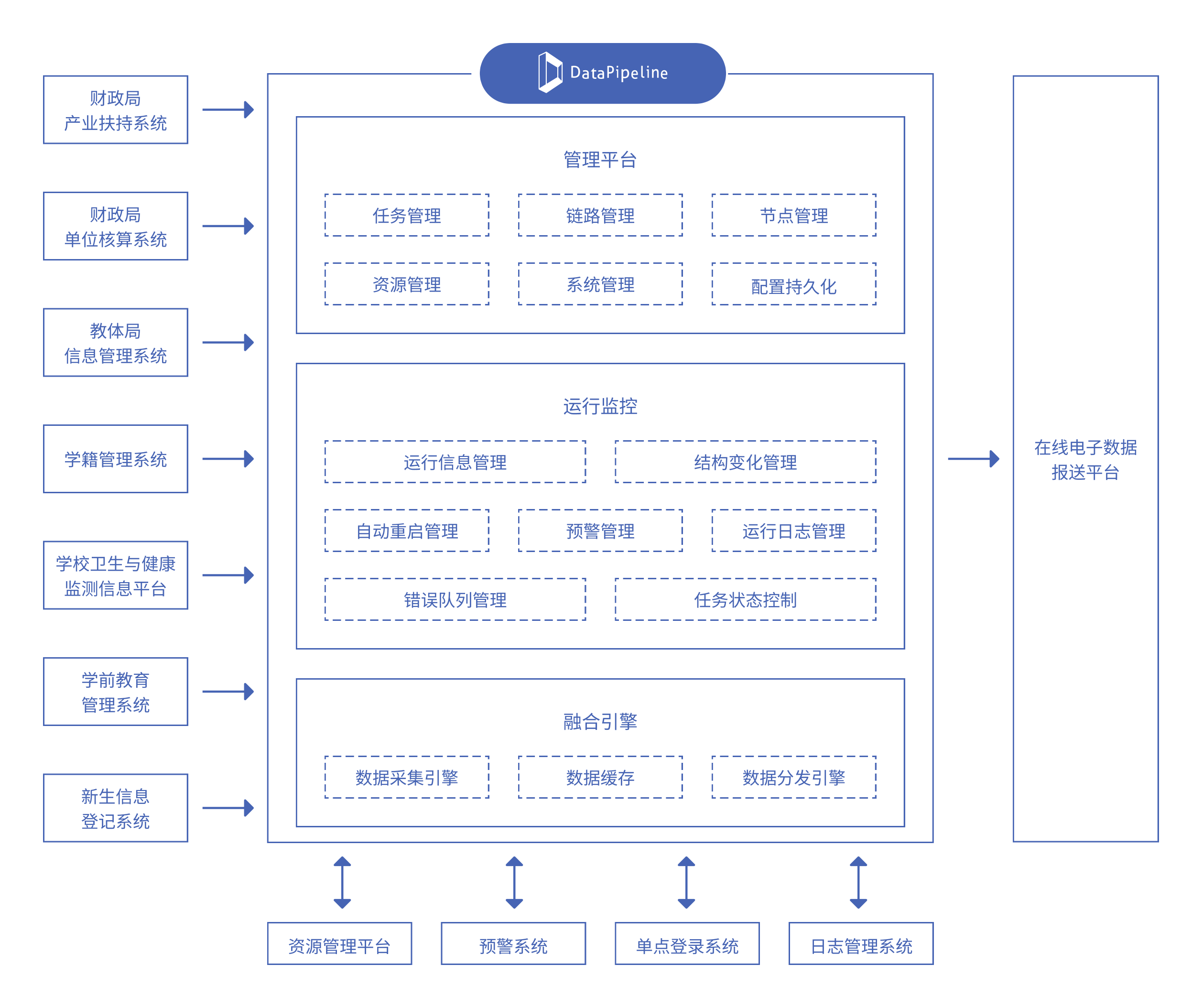 DataPipeline企业级实时数据融合平台通过适配多种数据库管理技术,为某市审计局提供了高效的解决方案,确保了被审计单位各业务系统的数据及所需文件能够实时且准确地采集与整合。此平台涵盖了财政局产业扶持系统、财政局单位核算系统、教体局信息管理系统、学籍管理系统、学校卫生与健康监测信息平台、学前教育管理系统、新生信息登记系统等多个数据源,并将采集的数据实时同步至下游的在线电子数据报送平台。