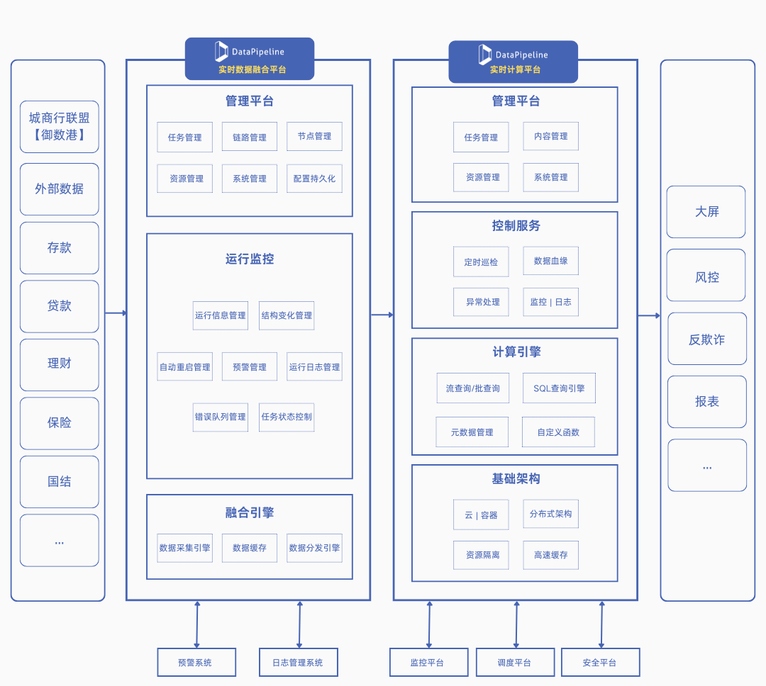 在此技术架构中,山东城商行联盟的“御数港”平台、多种外部数据源以及关键业务系统(如存款、贷款、理财、保险、国际结算等)的数据通过DataPipeline实时数据融合平台进行采集,并经DataPipeline实时计算平台处理。处理后的数据高效流转至下游系统,如可视化大屏、风险控制、反欺诈及报表系统等,确保数据的即时可用性和支持决策的实时性。